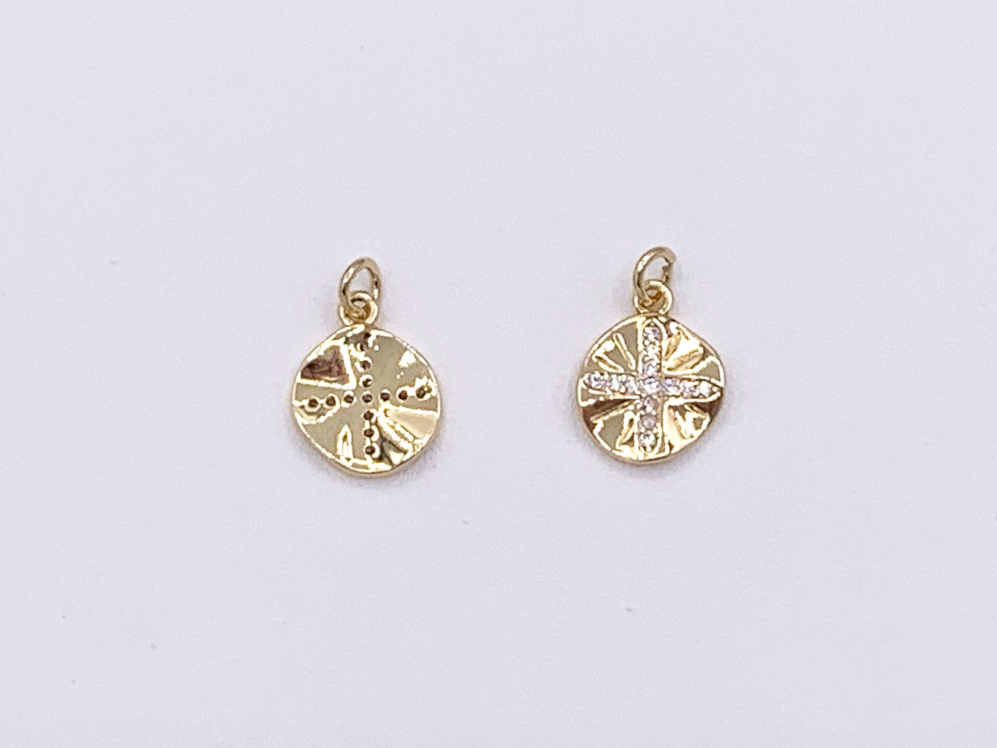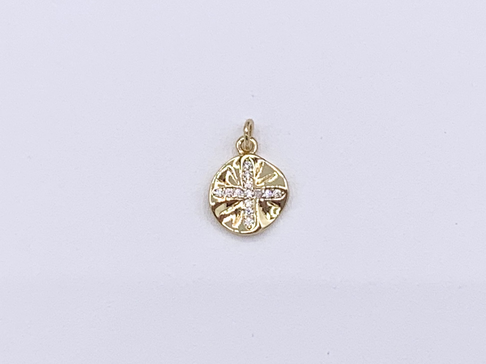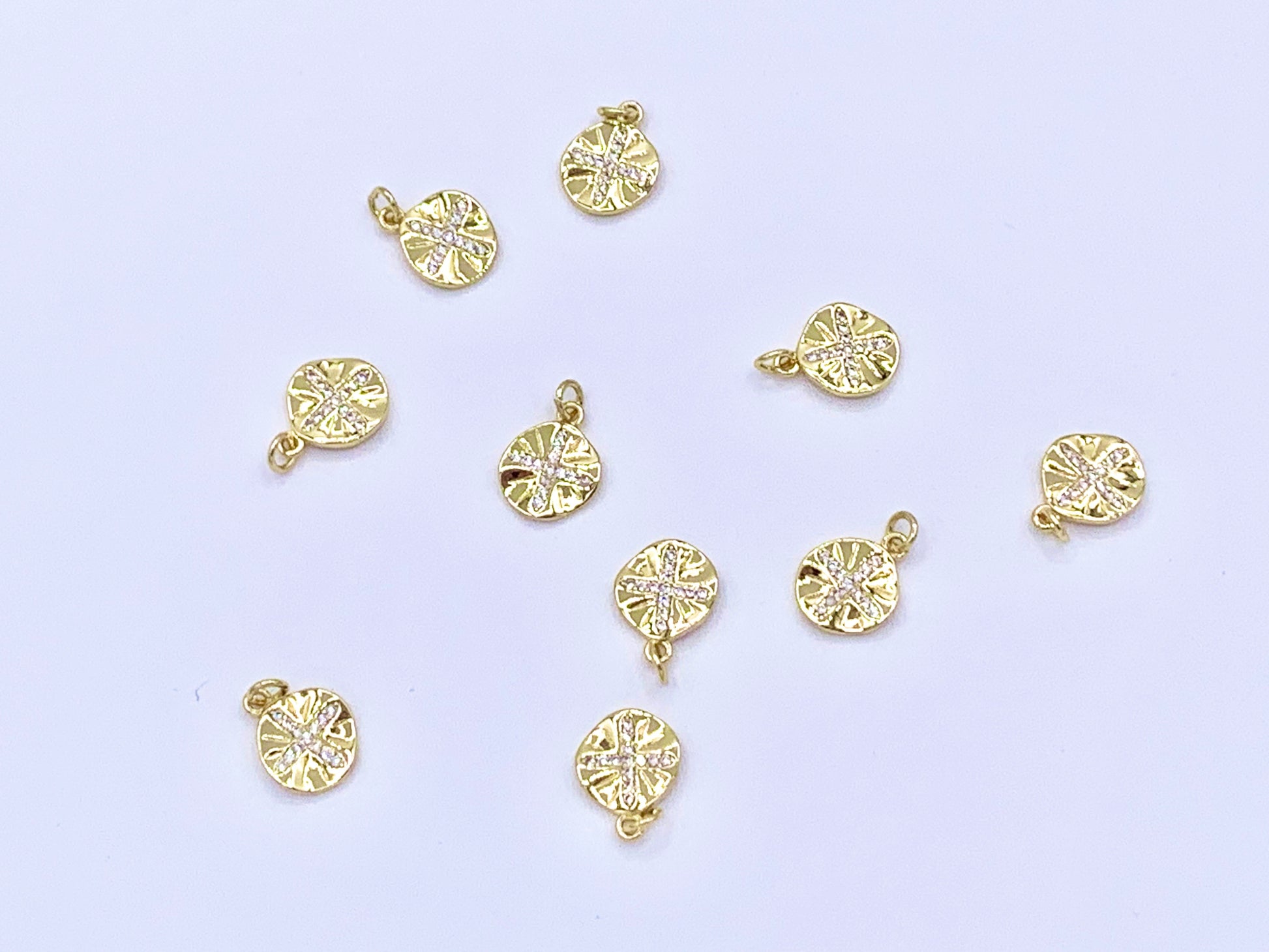 Cute Wavy Cross Coin Charms in CZ Pave plated in 18K Gold Copper Base. These charms can be wonderful made into bracelets, dainty necklaces, earring drops and even used for crafts.