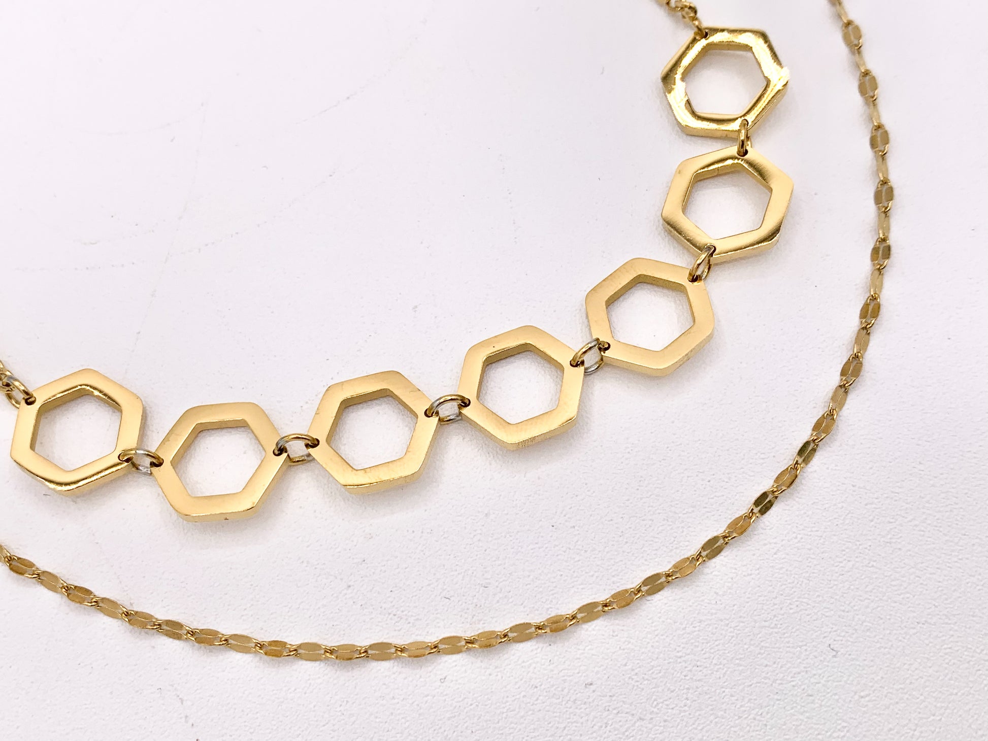 Dainty 2 Layers Honeycomb Hexagon Link Necklace Gold Plated Stainless Steel Dainty Flexible Minimalist Finished Necklace 14" with Extension 1 pc