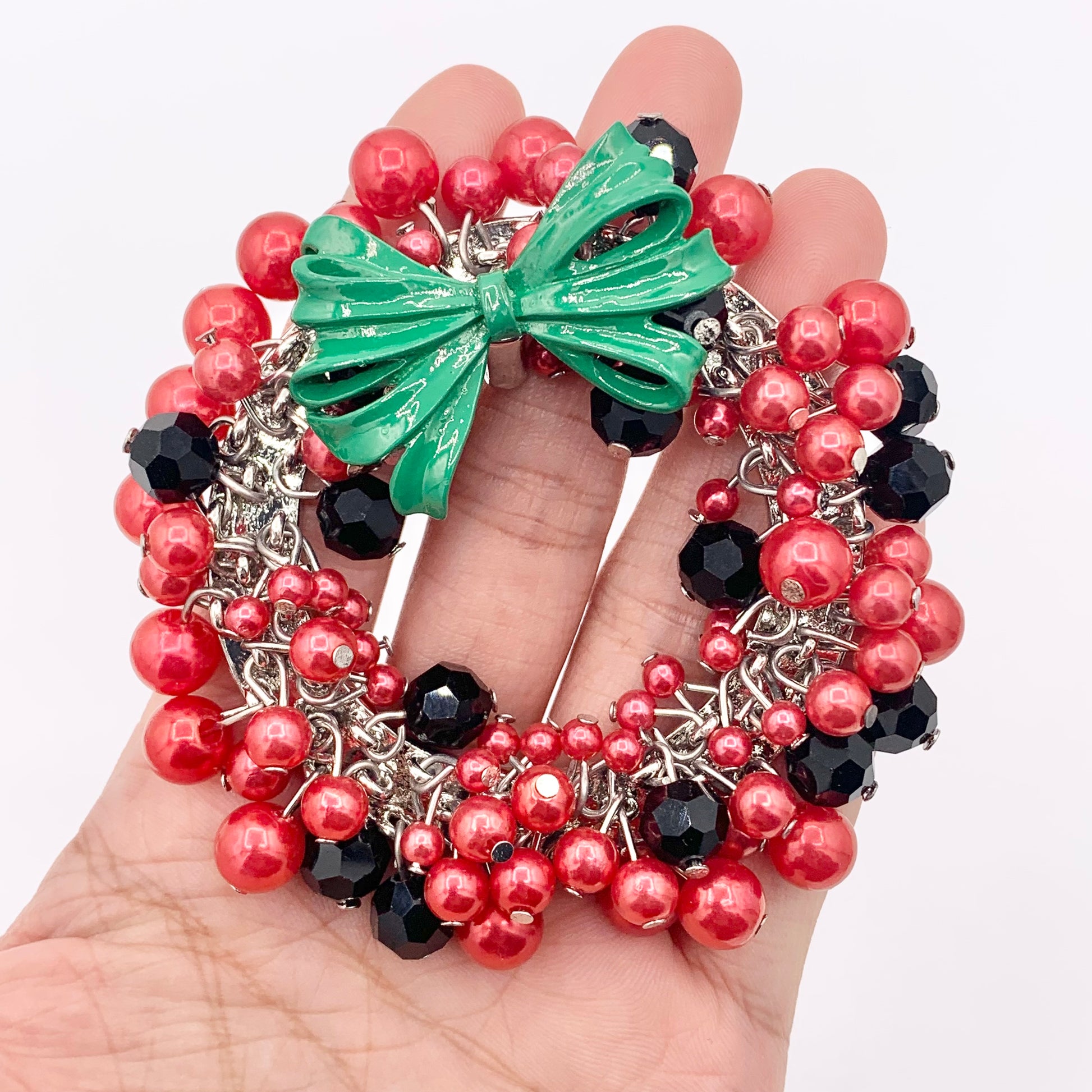 Dangle Beaded Christmas Wreath Holiday Decoration Red and Green Pendant With Crystal & Imitation Pearls