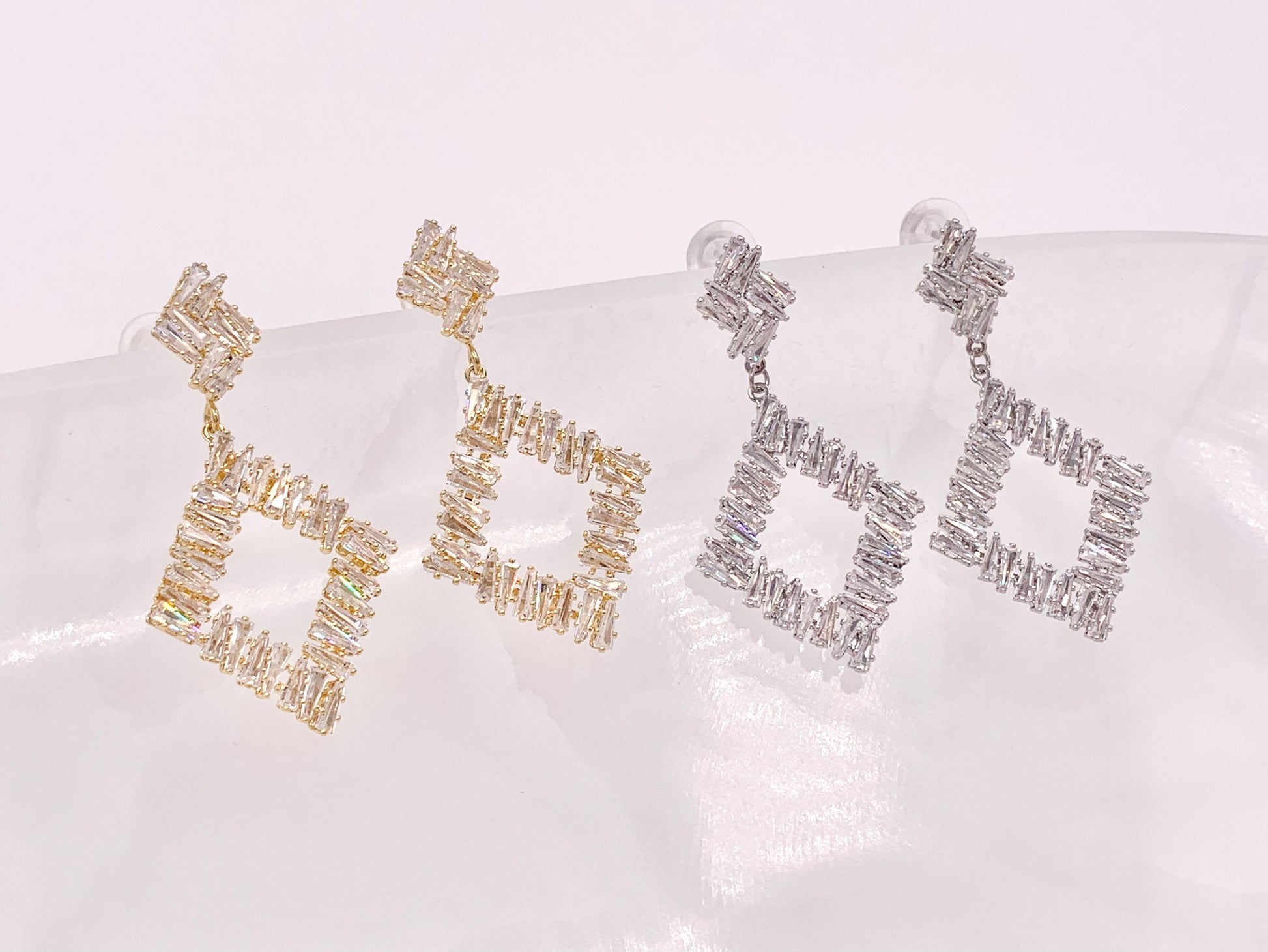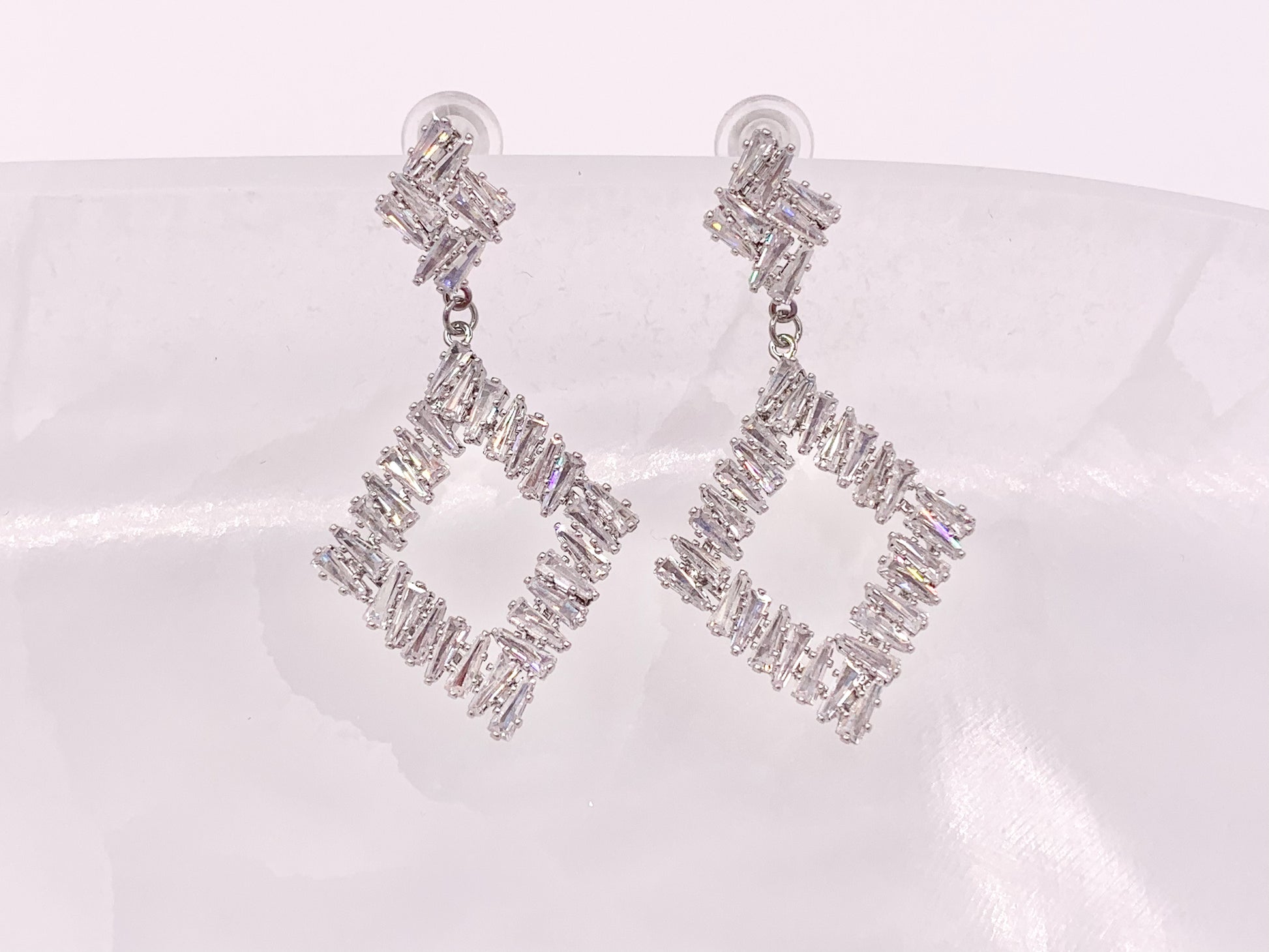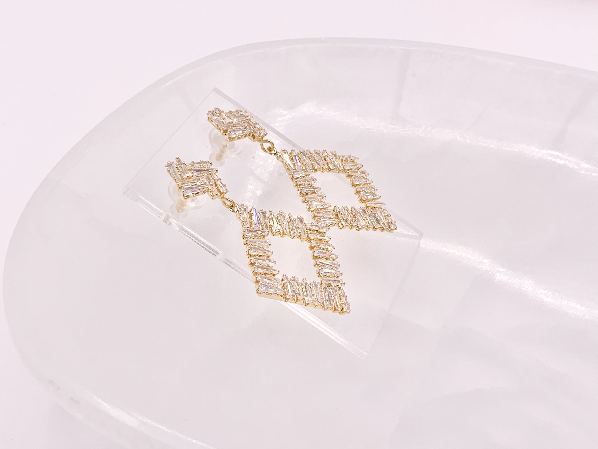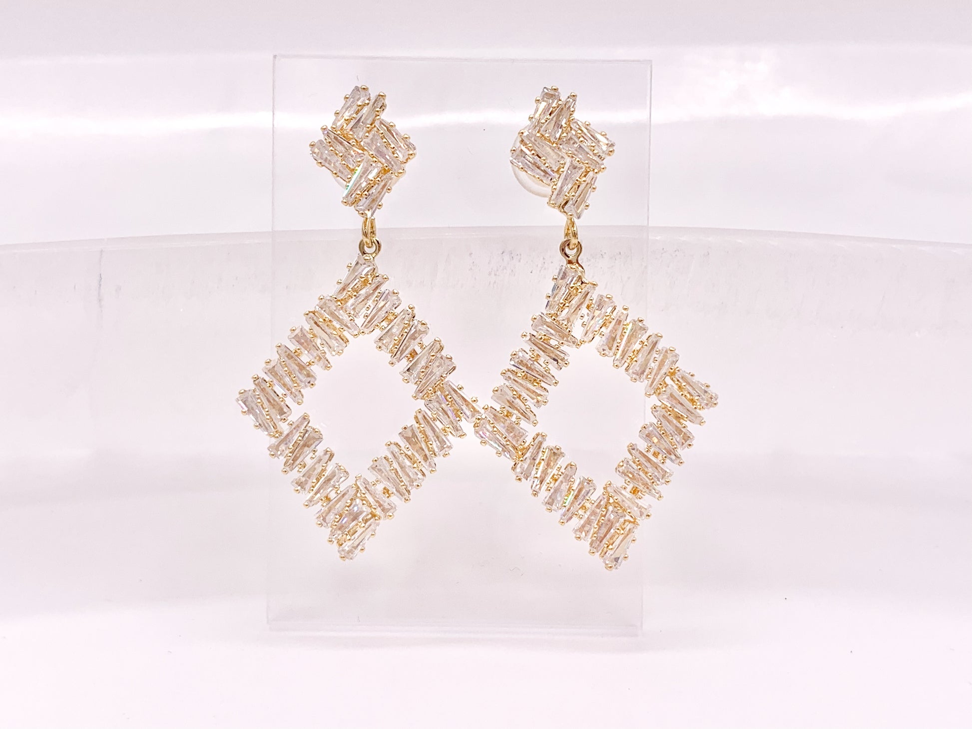 Gold CZ Pave Rhinestone Diamond Shape Baguette Earring in 18k Gold and Silver Over Copper