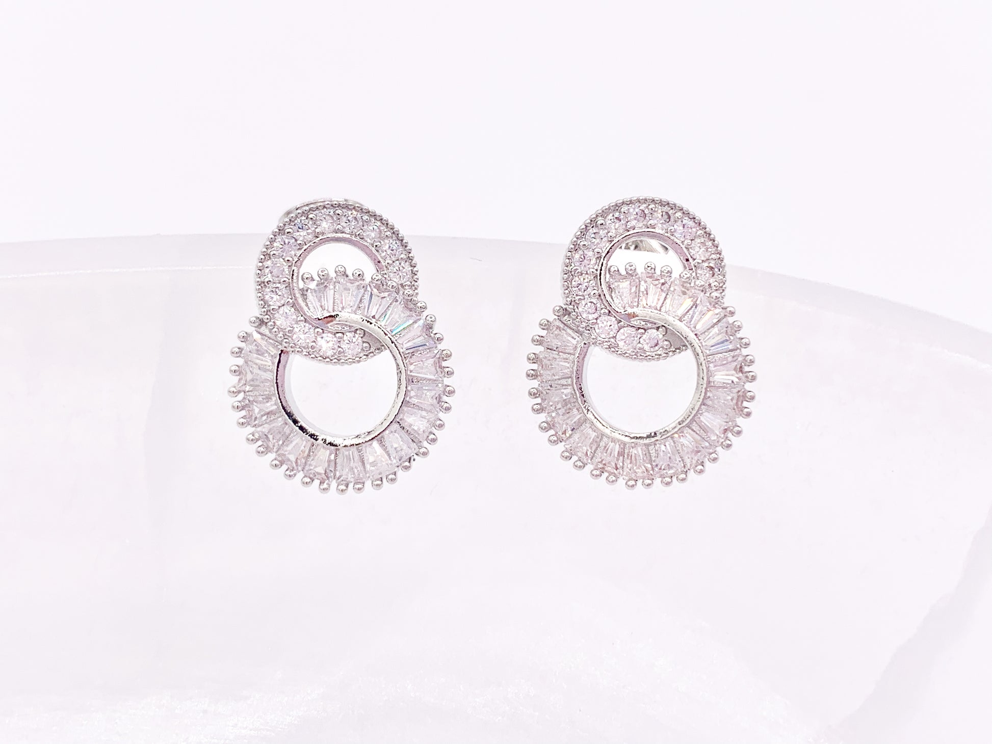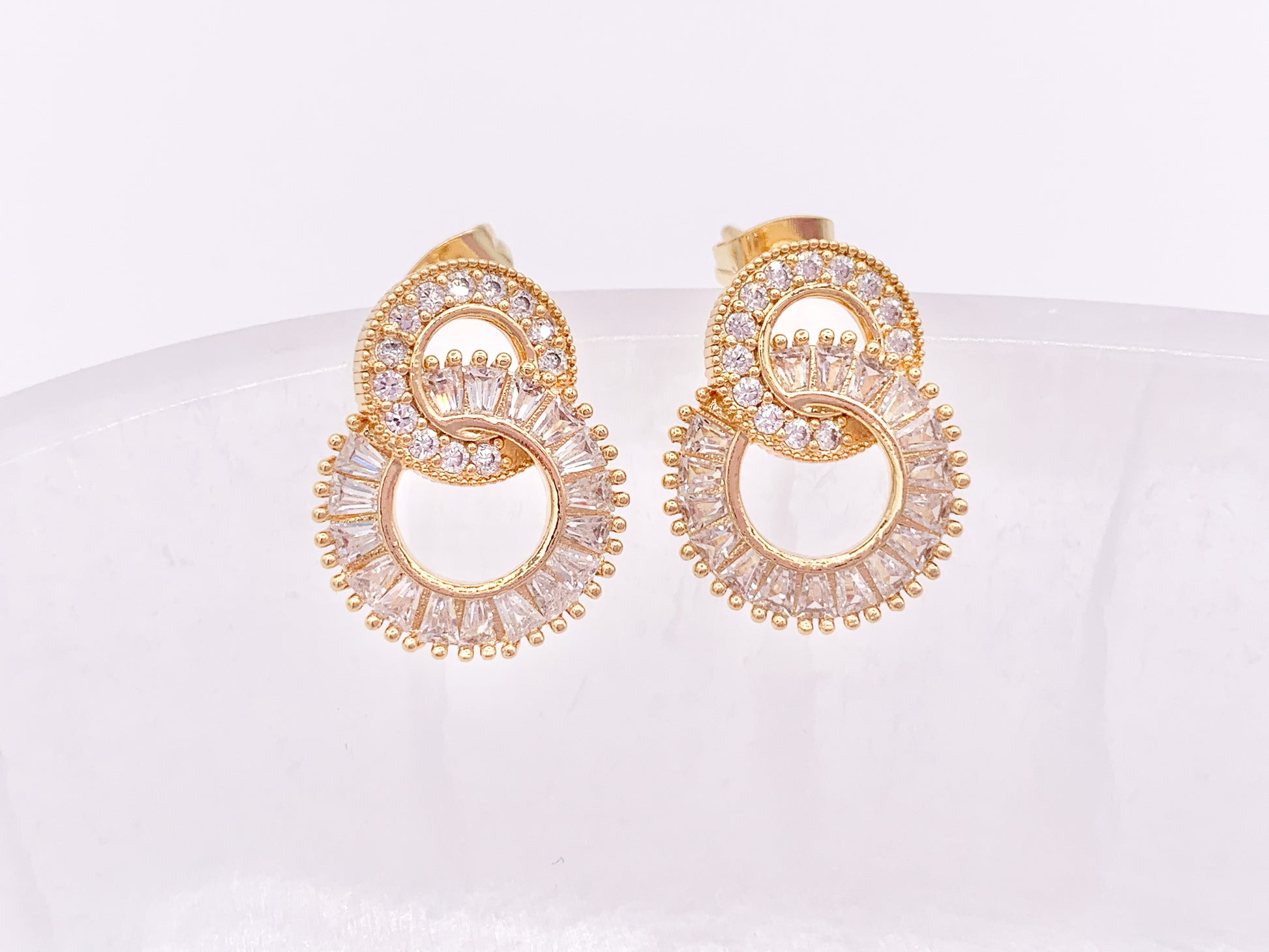 Double Circle Loop Interlock Earring Studs in Rhinestone CZ Pave Designed in 18K Gold or Silver Plated Copper
