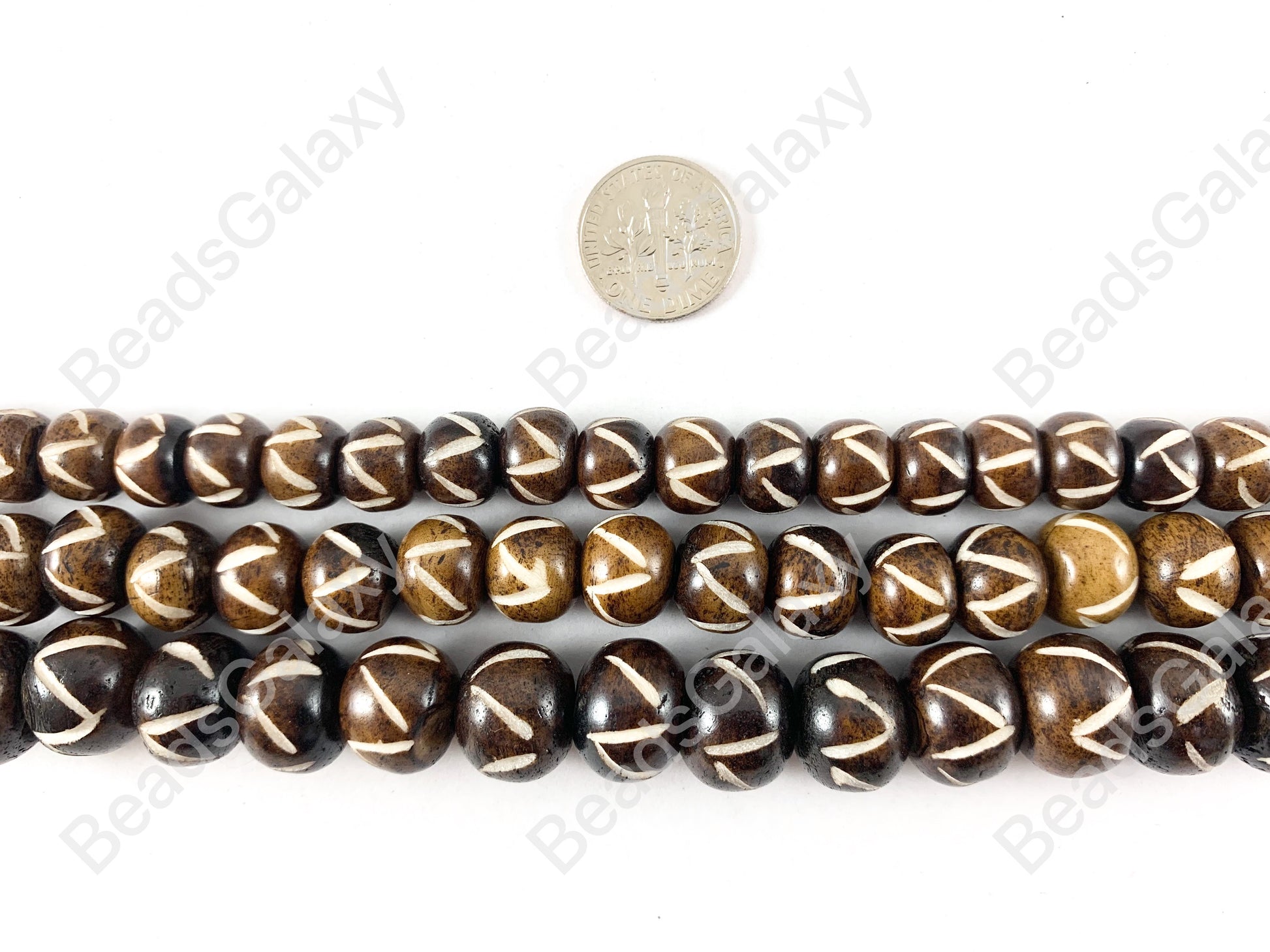 Hand Carved Bone - Brown Etched Zigzag Pattern Shiny Glossy Finish Bone Beads