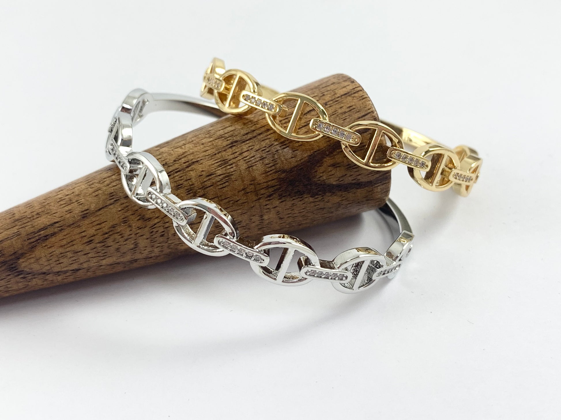 Mariner Coffee Bean Link Bling Stackable Bracelet Cuff in Gold or Silver Plated CZ Pave Adjustable Pig Nose Bracelet Cuffs over Brass 1 bracelet