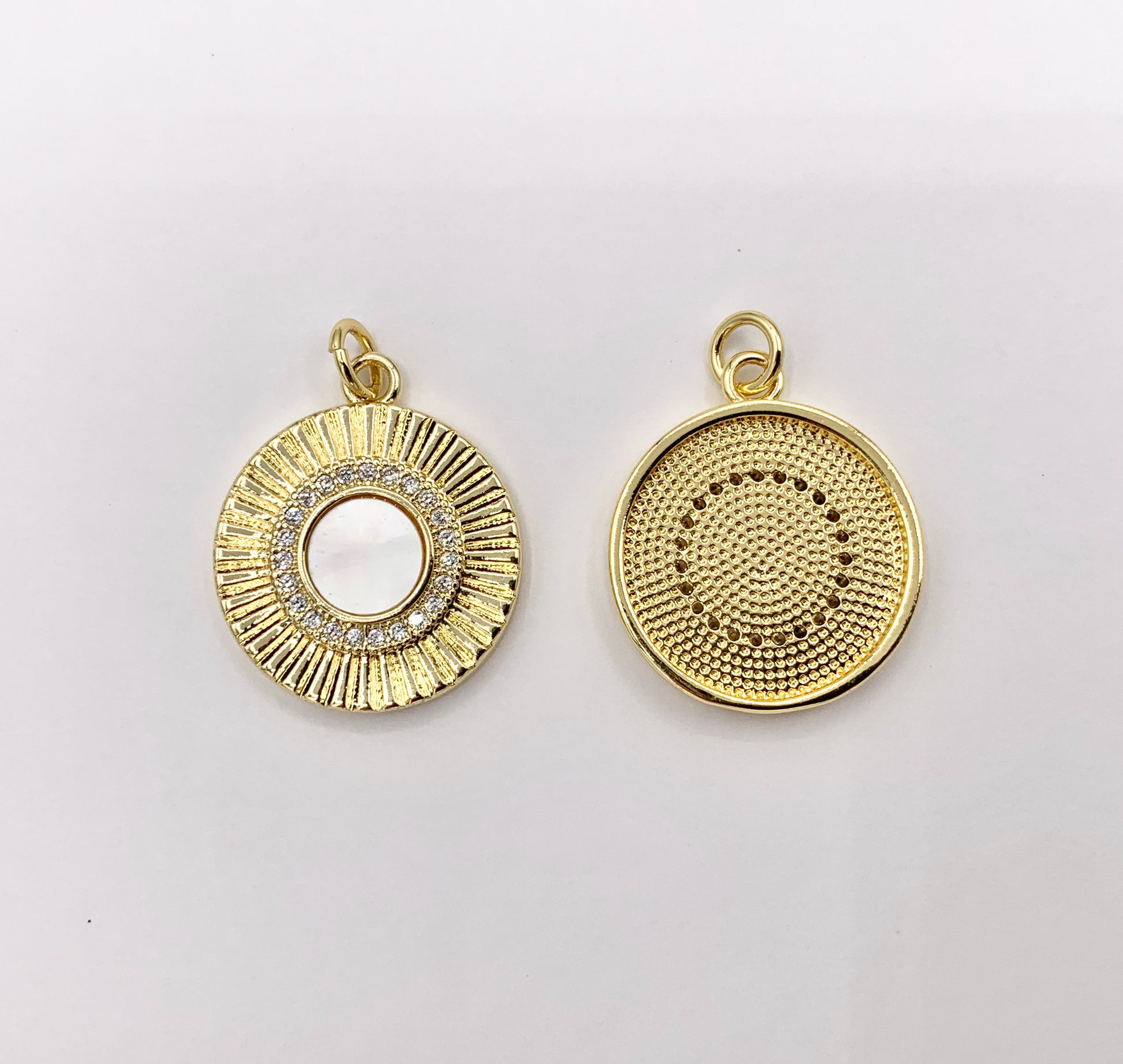 Mother of Pearl Coin Pendant CZ Pave Charm in Real Gold 18K Plated Over Brass 5 PCS