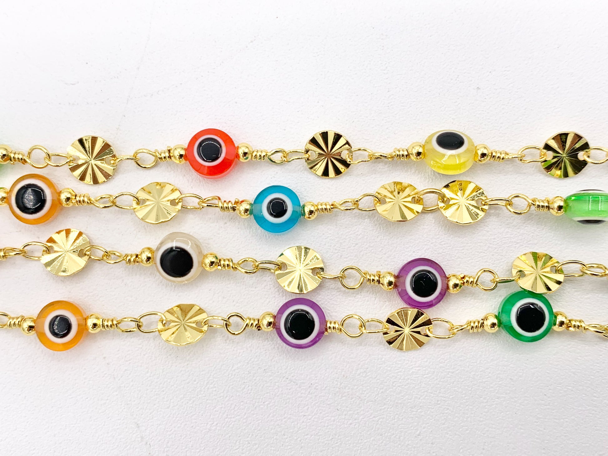 Multicolor Enamel Evil Eye + Gold Coin Disc Chain in 18K Gold Plated Copper 1 Spool