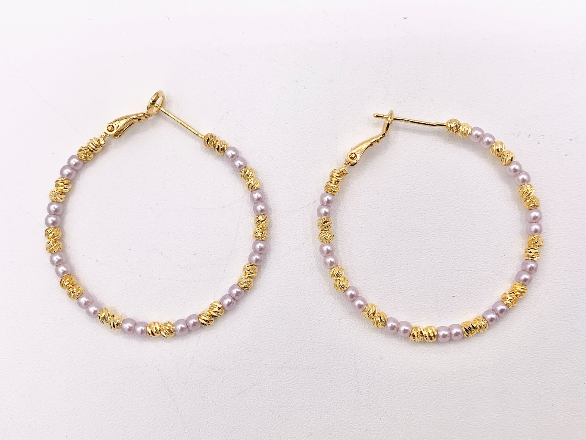 Purple Pearl + Etched Gold Beads Beaded Earring Hoop in Real Gold 18K Over Copper 3 PAIRS