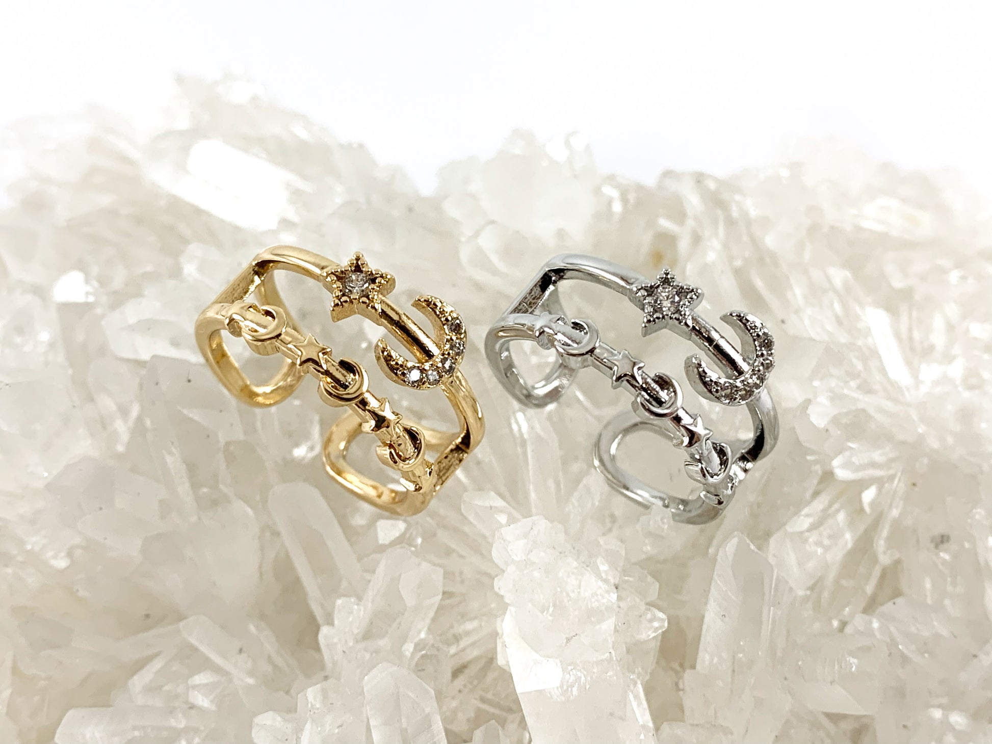 Real 18K Gold and Platinum Plated CZ Pave Adjustable Star Moon Crescent Ring 4pcs