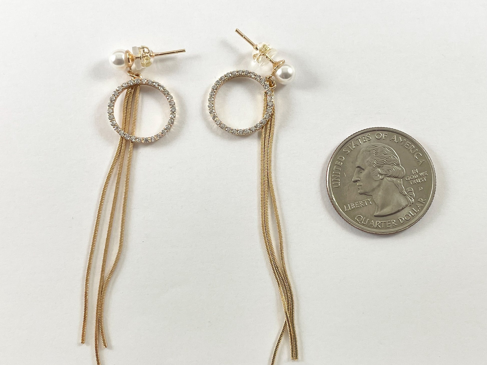 Real 18K Gold Plated Circle CZ Pave Pearl Long Dainty Tassel Earring Over Copper 3 pairs