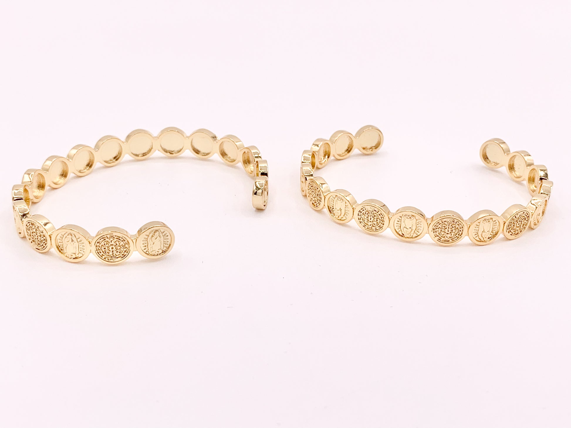 Real Gold 18K Plated Copper Religious Mary St Benedict Coin Adjustable Bracelet Cuff 2 pc