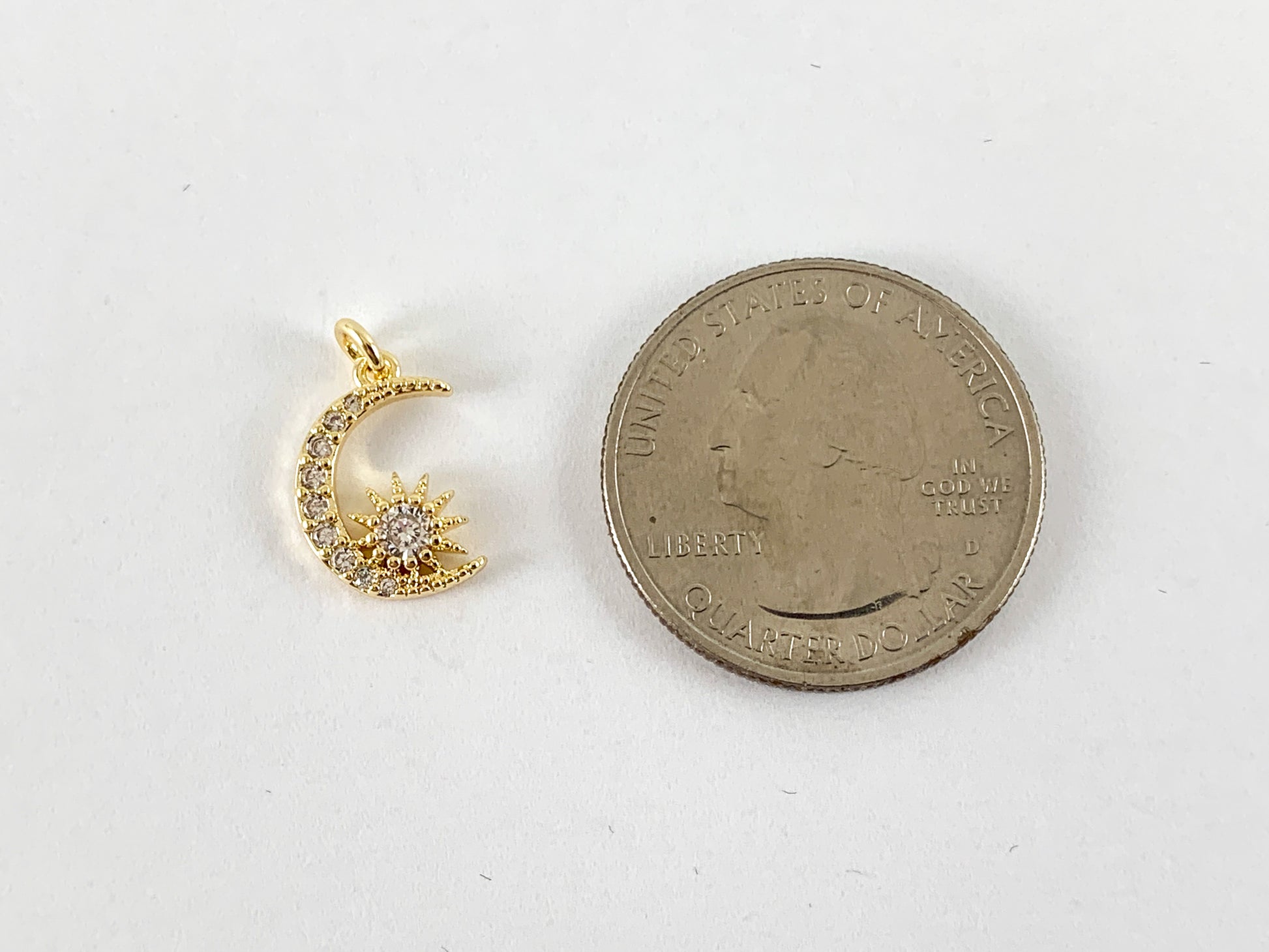 These cute little moon crescent/star burst charms are real gold 18K plated with a brass base. These charms can be wonderful made into bracelets, dainty necklaces, earring drops and even used for crafts.