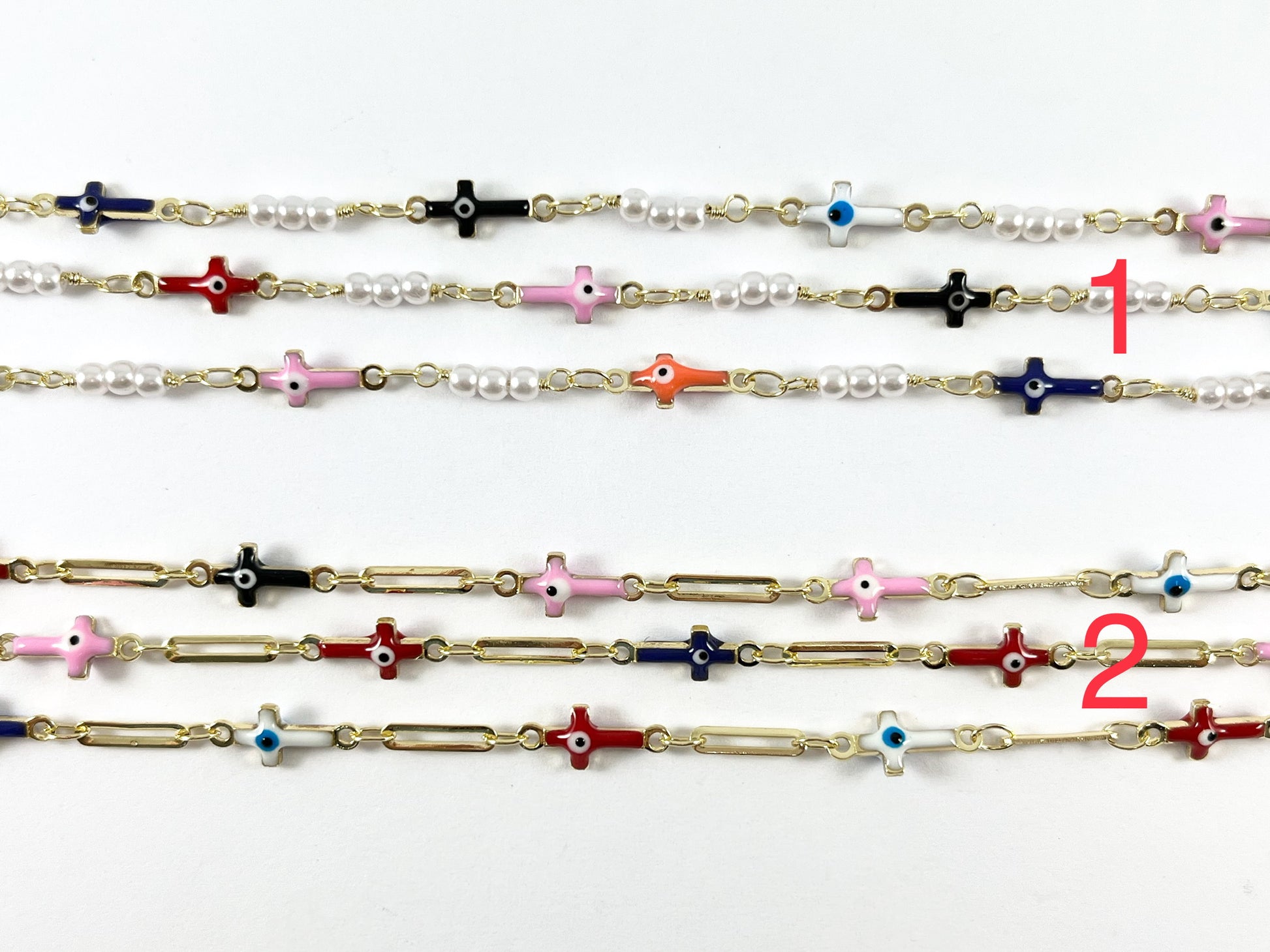 Real Gold 18K Plated Multicolor Enamel Cross Evil Eye with Imitation Pearl Chain By The Yard For Jewelry Making/Designs
