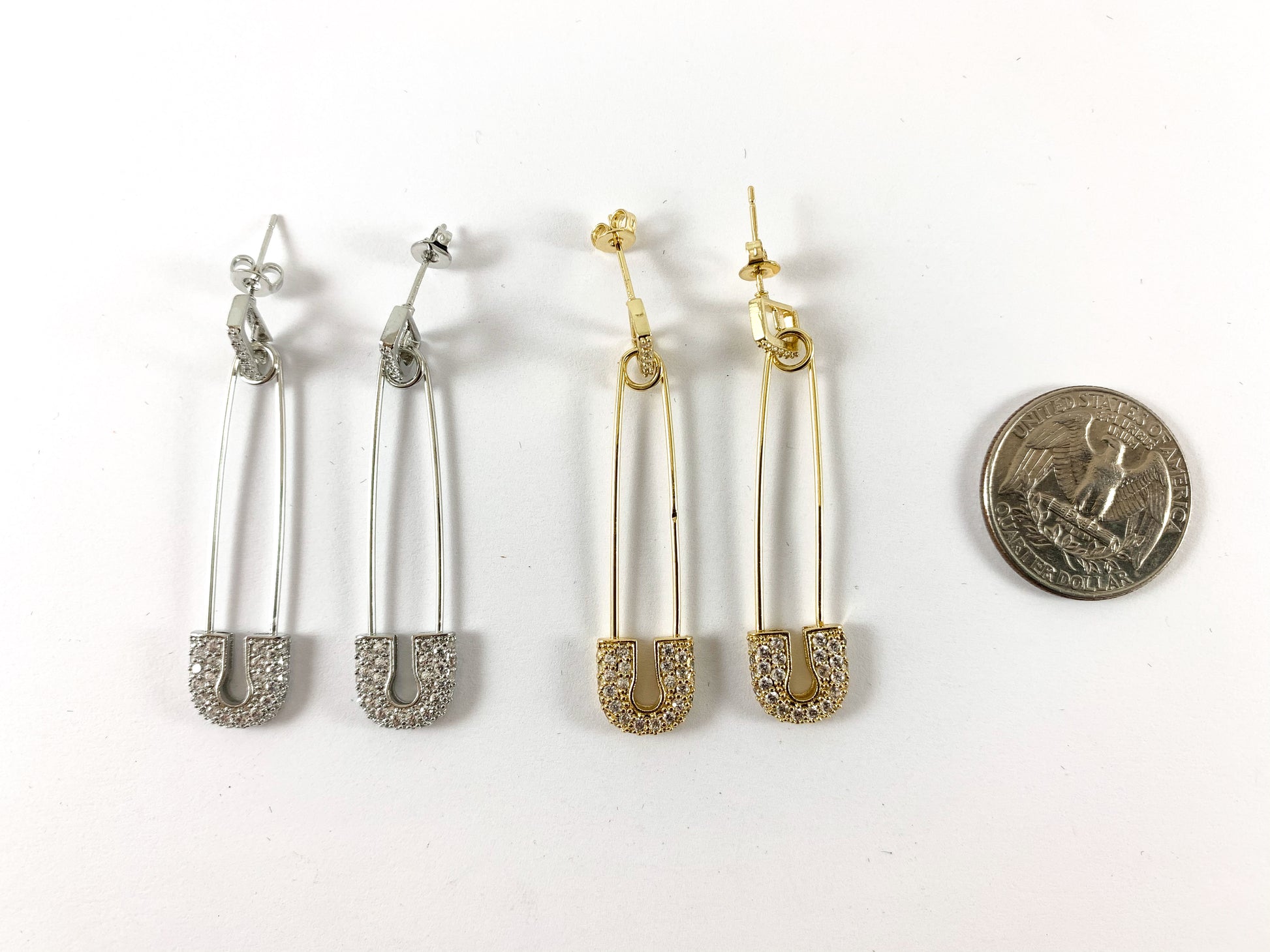 Real Gold/Platinum 18K Plated CZ Pave Safety Pin Dangle Earring 2 pairs