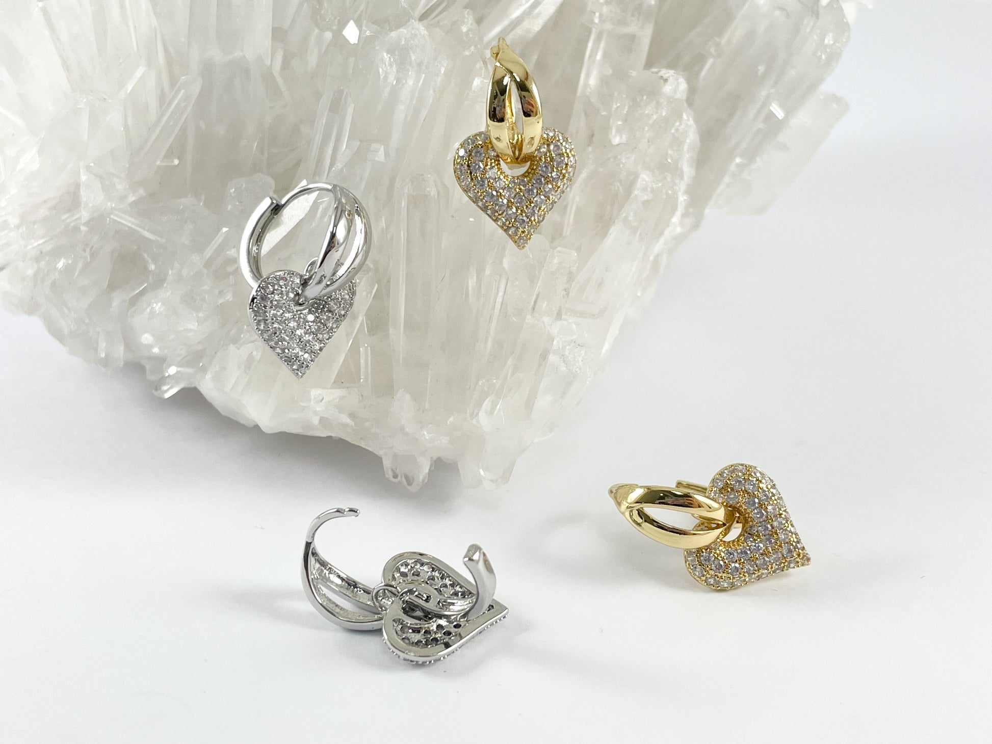Real Gold/Silver 18K Micro CZ Pave Dangle Heart Earrings Huggies 3 pairs