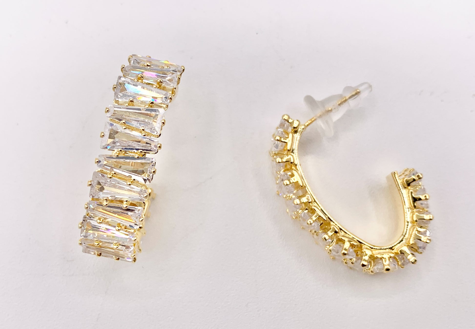 Trendsetting Unique Curve Link CZ Pave Baguette Hoop Earrings in 18K Gold Plated Copper 2 PAIRS