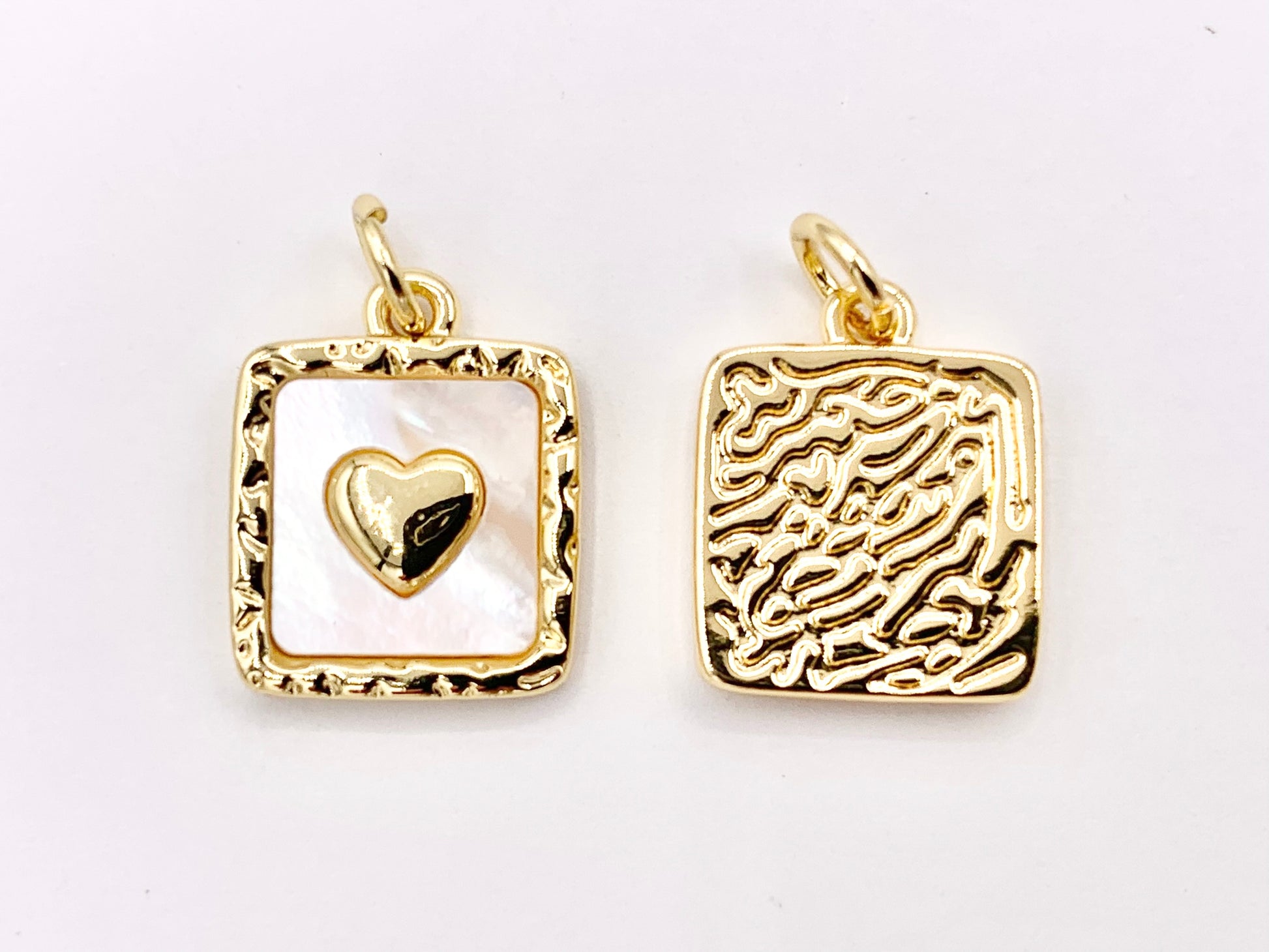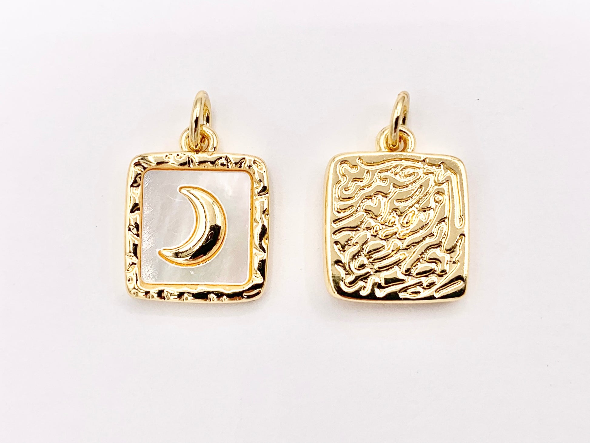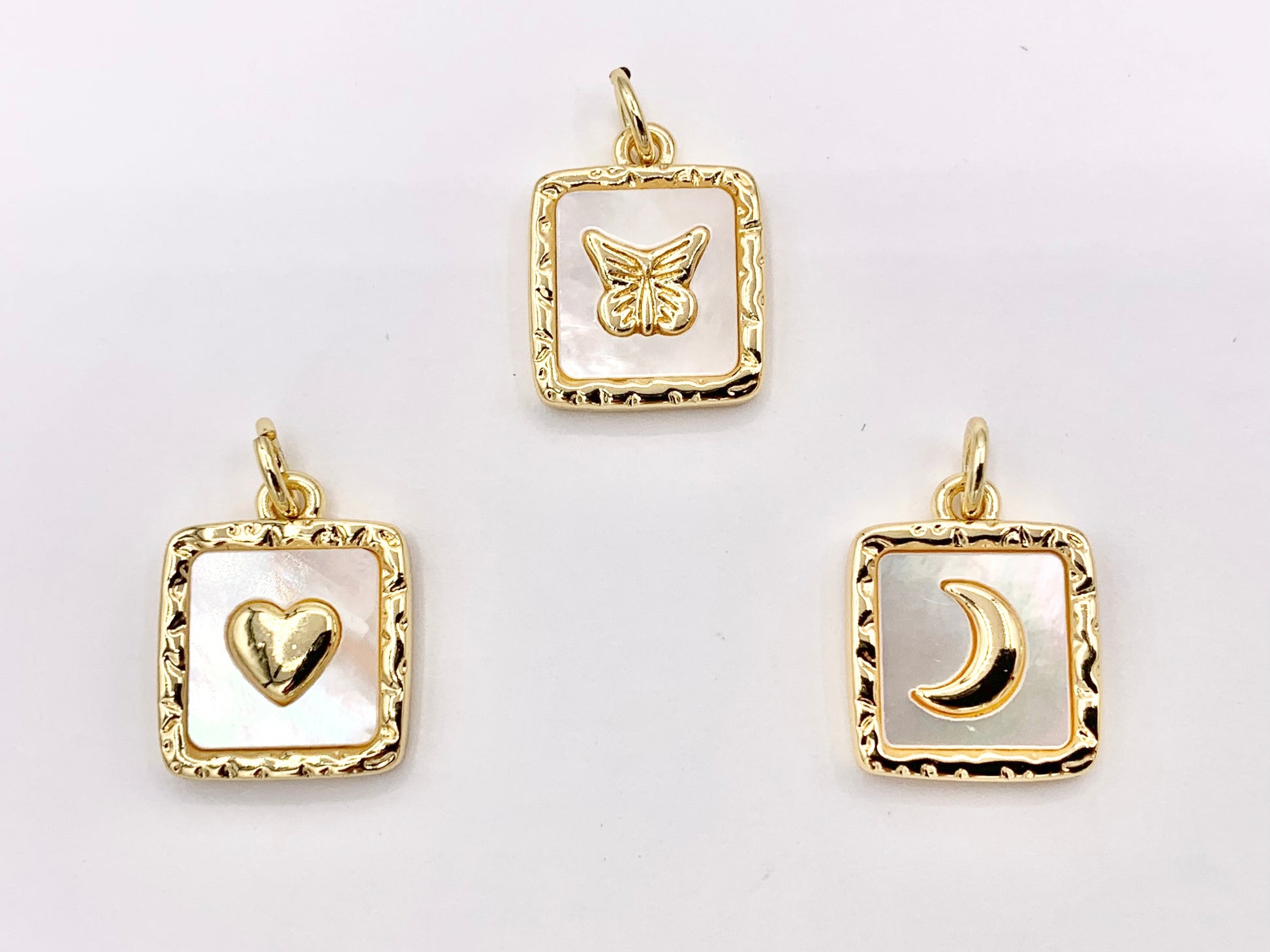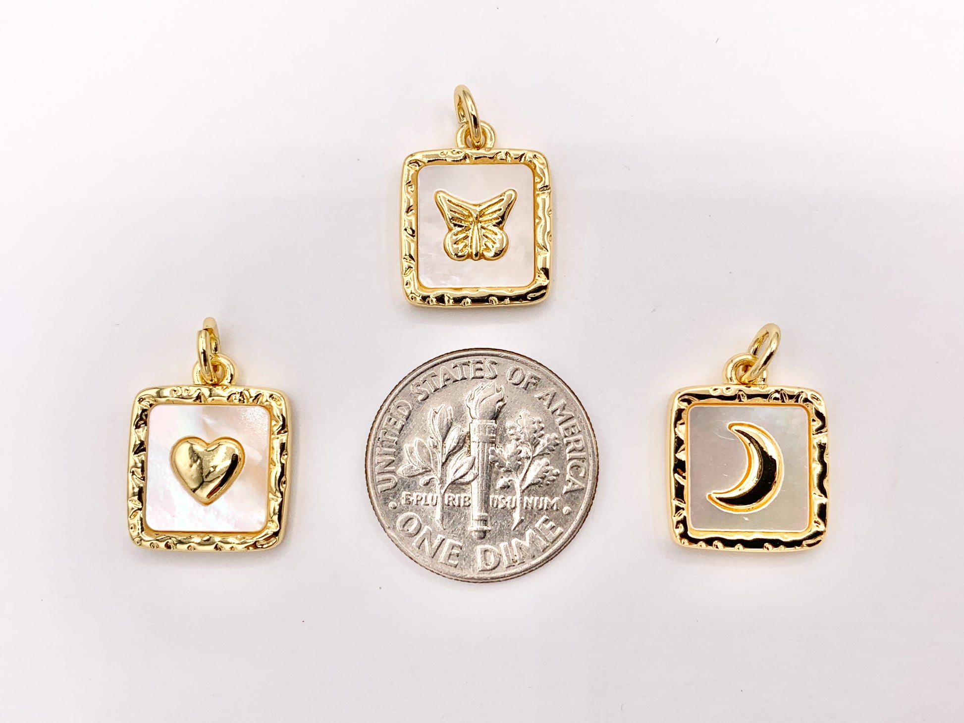 White Lip Shell Square Charms With Heart, Moon Crescent and Butterfly in 18K Gold Plated over Copper 6 PCS