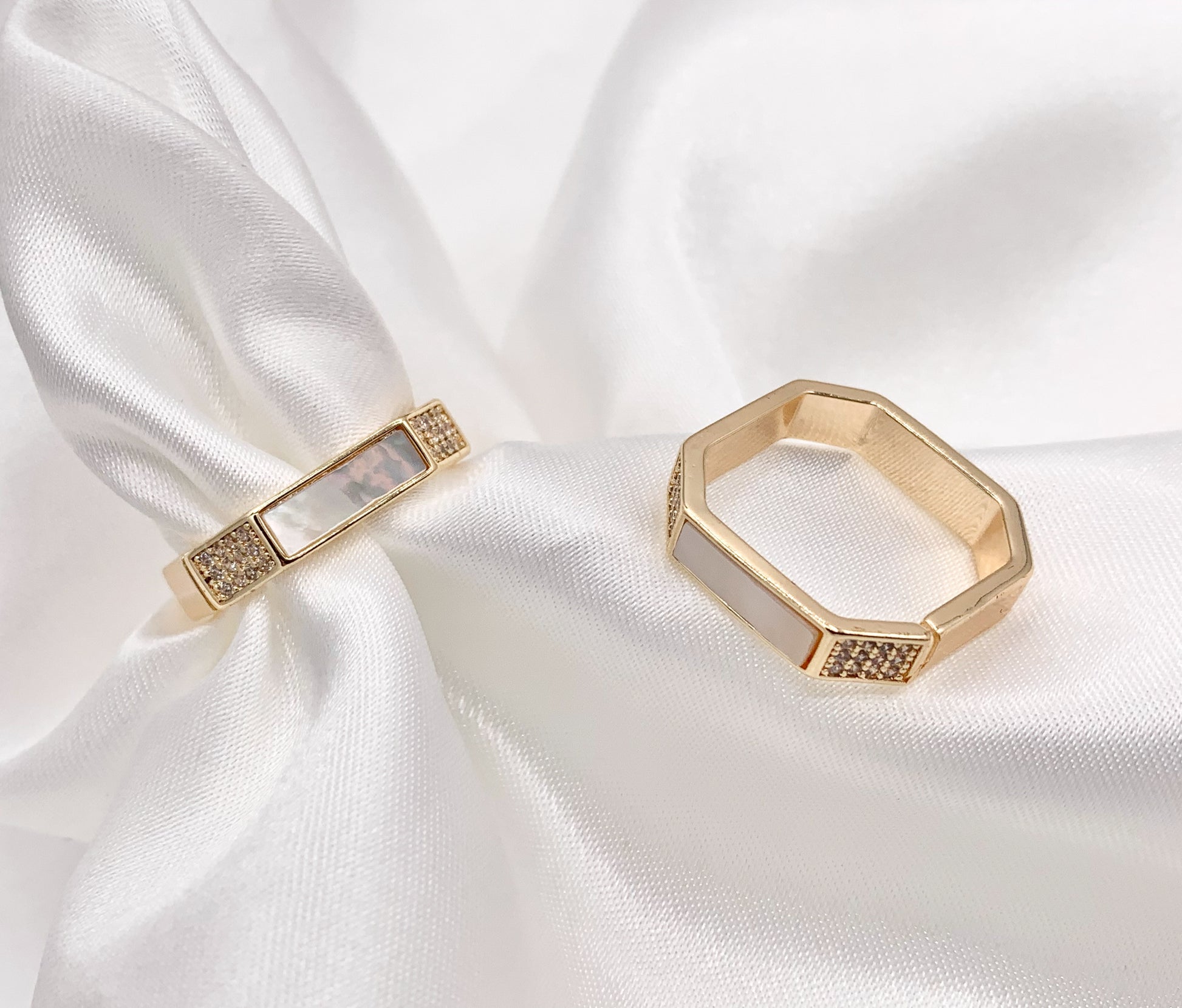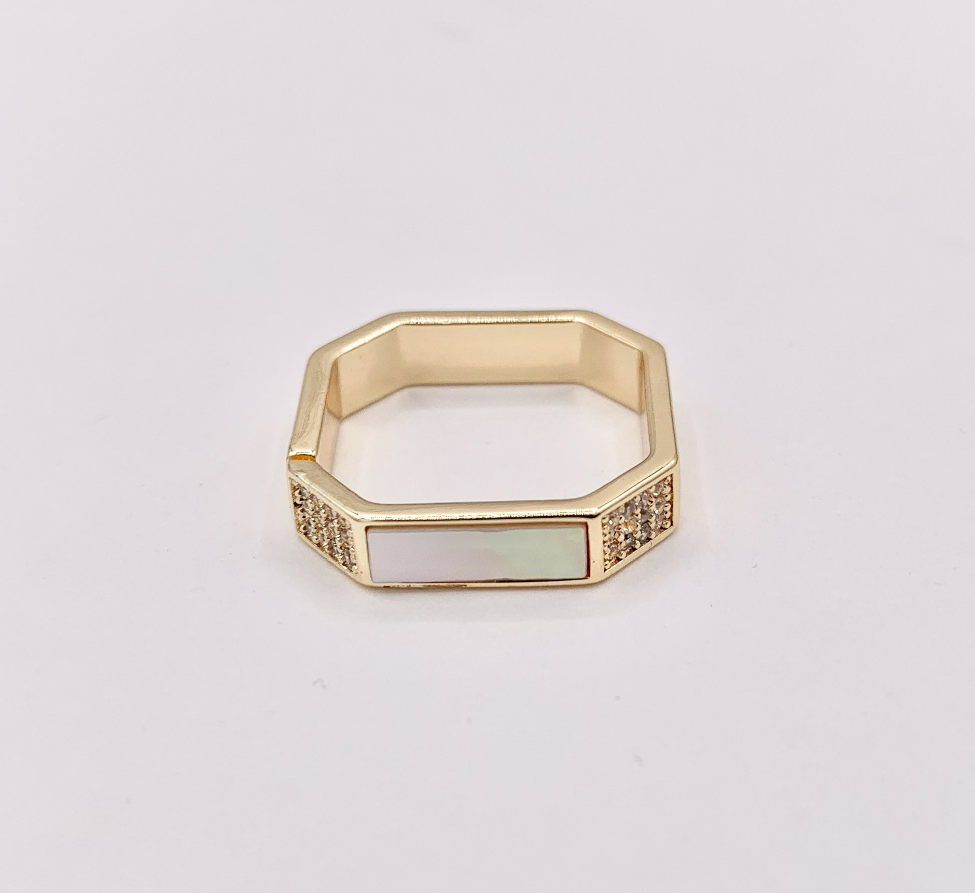 White Shell Banded CZ Pave Square Adjustable Ring in 18K Gold Plated Copper 4 PCS
